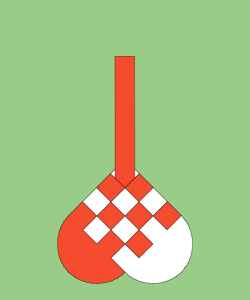 Før man starter med at flette, skal man folde det "røde" stykke ud, og trække strimlerne fra det "hvide" stykke gennem det "røde" stykke.