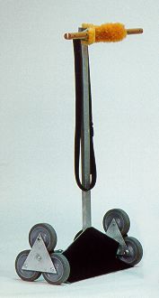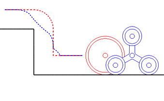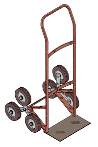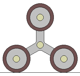 Tre almindelige fritroterende hjul er placeret på en trearmet holder, som selv frit kan rotere. Når et trappetrin krydses vil den trearmede holder rotere 1/3 omgang.